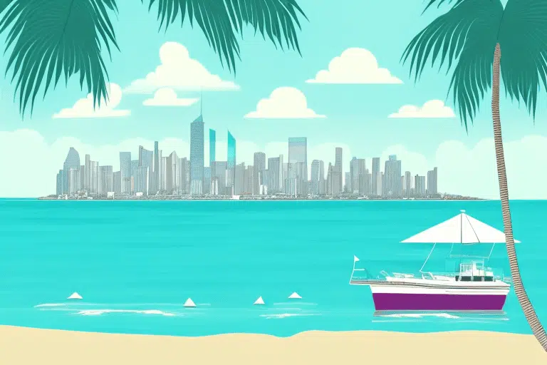 spiaggia tropicale con barca a vela e lo skyline di CittĂ  di Panama come sfondo